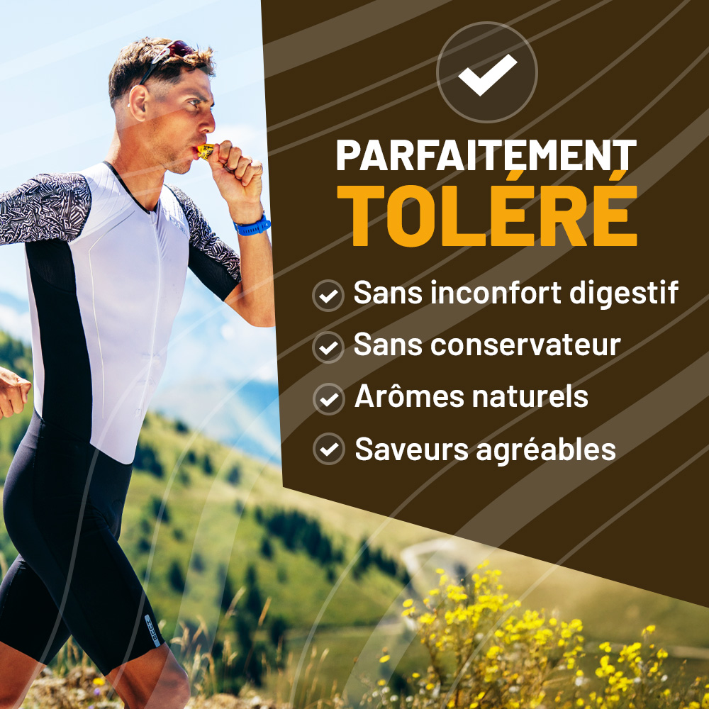 With 80 mg of natural origin caffeine, it has a stimulating action to maximize your performance by improving your endurance and to amplify your concentration and alertness, a major asset for long or nighttime events.