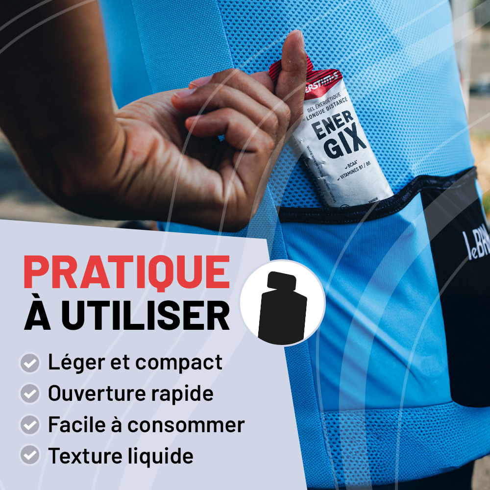 Thanks to its innovative formula composed of 3 sources of carbohydrates (glucose, fructose, maltodextrin), the ENERGIX gel delivers progressive and lasting energy to support your endurance and maintain optimal performance levels throughout the effort.